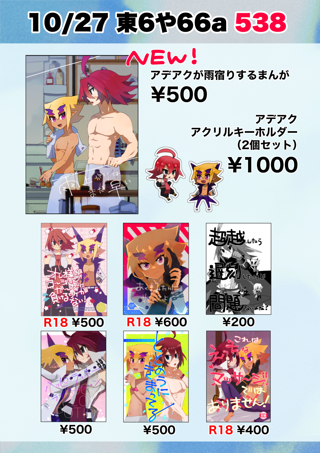 頒布物はすべてアデアクです。同人誌は全体的に「ちょっとえっちなラブコメ」の雰囲気です。男性向けR18が好きなので(…)R18本はそういうノリです。年齢確認のご協力、よろしくお願いします!