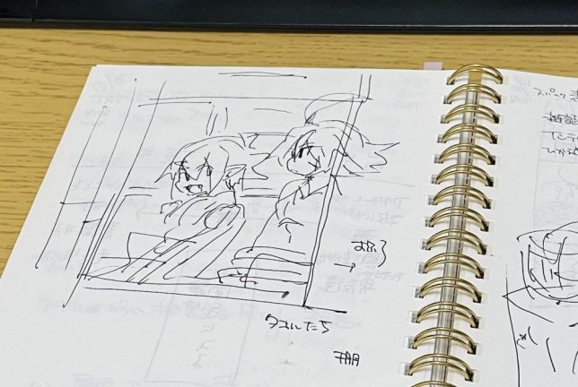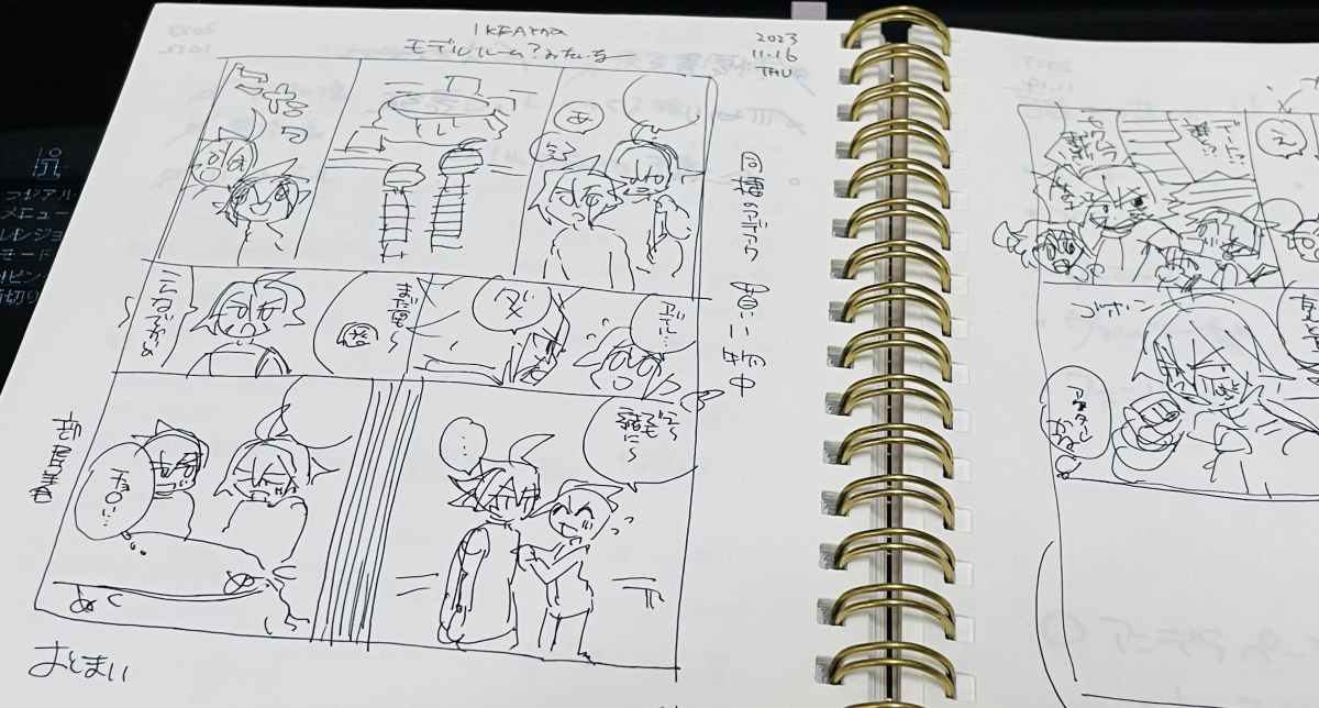 あとはプロットというか、描きたい本のおおまかな流れや描きたい要素(キスする、一緒にお風呂に入るとか)をば〜っと書いたりしています。それらをもとにした、しっかりした(セリフ込みの)プロットはiPhoneのメモ帳アプリで入力しています。なので原稿におけるアナログ作業は意外と少ない…!