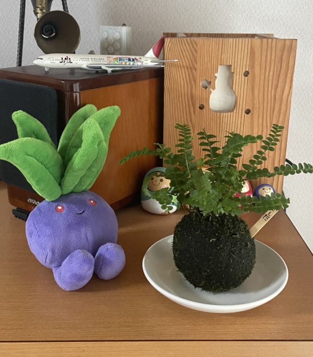 実家で苔玉を育てはじめたので、ここぞとばかりにナゾノクサを連れてきました。熱いツーショットです!シルエットが一緒でかわいい。