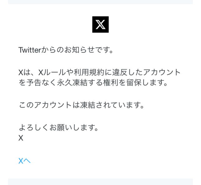 自分のページに行くと、Xルールに違反しているので凍結しました、と表示されていました。