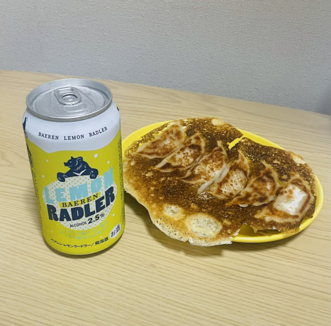 ベアレンのレモンラードラーです!隣は味の素のしょうが餃子です。