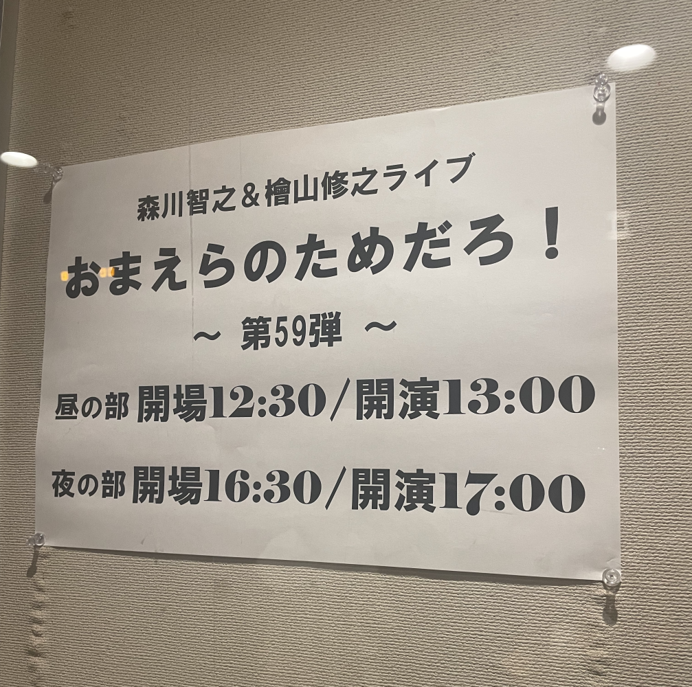 「おまえらのためだろ!」は森川・檜山の声優イベントです。今回で開催第59弾、30周年というとんでもないイベント…!前から6列目くらいで通路側の席でした。いままでで一番良い席でびっくりしました!(登場時やエンディングで声優が通路側歩いてくれるので)