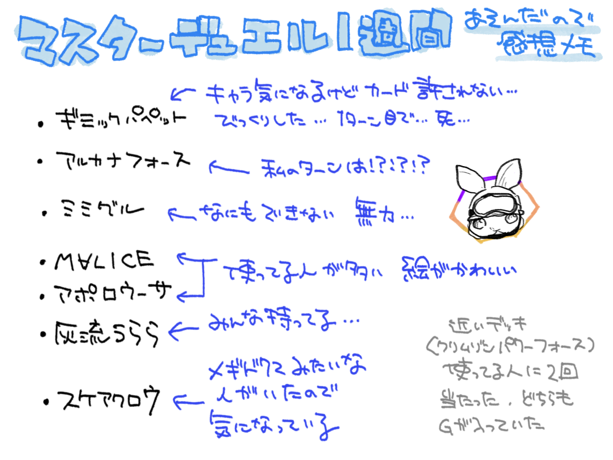 マスターデュエルをはじめて1ヶ月経ちました。え!もう1ヶ月もデュエルを…!? #MD デモンスミス好きだろうな…と思います。 これは1週間遊んだときに書いたメモ(というか負けたときの感想)です。 さまざまな敗北…ッ!でも楽しい!勝ったらもっと楽しいです!それはそう! 2025.8.9.(Sat) 10:22